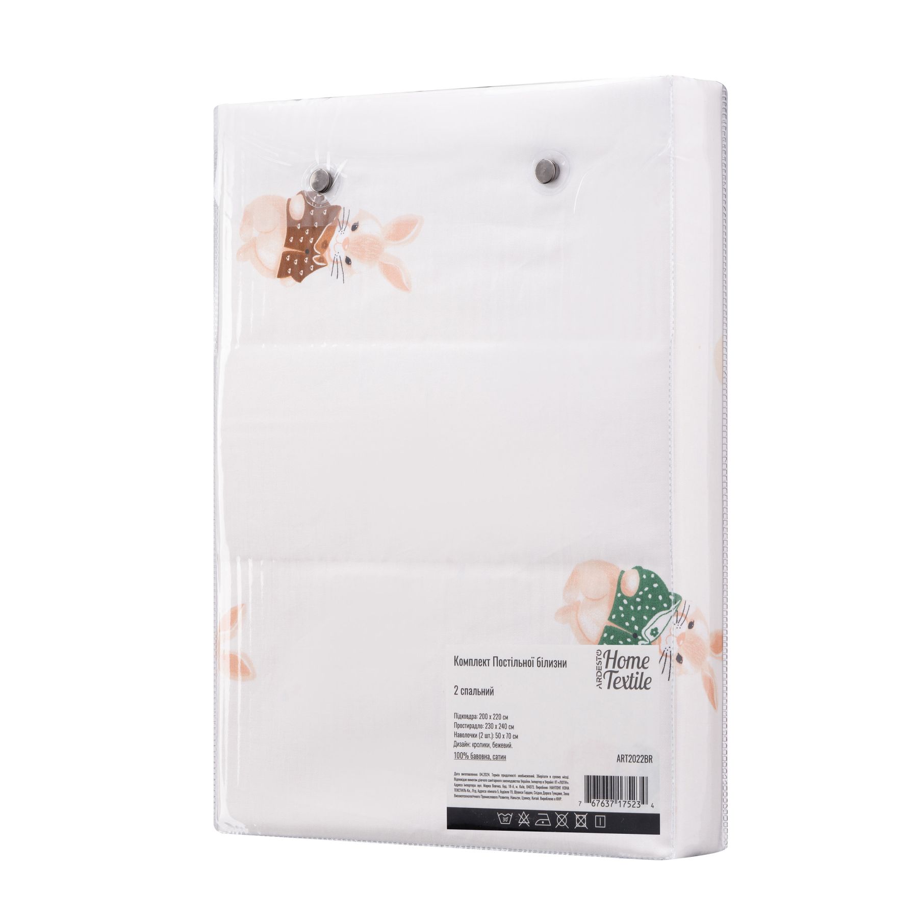Bedding set ARDESTO 2.0 Gloria, sateen, rabbits, beige, duvet cover 200x220cm, bed sheet 230x240cm, pillowcases (2) 50x70cm, 100% cotton