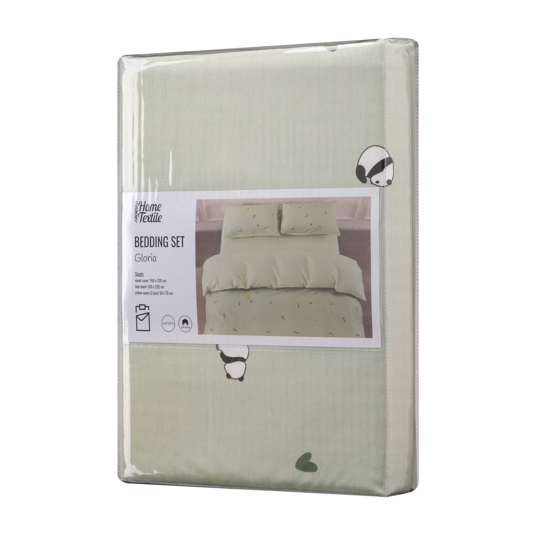 КПБ 1,5сп ARDESTO Gloria, пододеяльник 160х220см, простынь 160х220см, наволочки (2) 50х70см, 100% хлопок, сатин, панды, зеленый