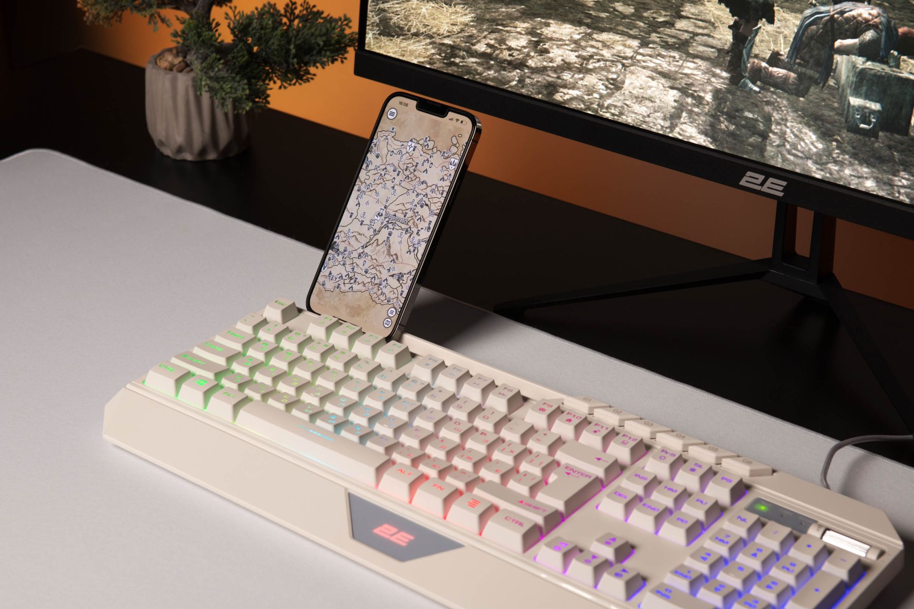 Клавіатура має вбудований тримач для смартфона або планшета, що робить багатозадачність не лише можливою, а і зручною. До того ж передбачено українську та англійську локалізацію.